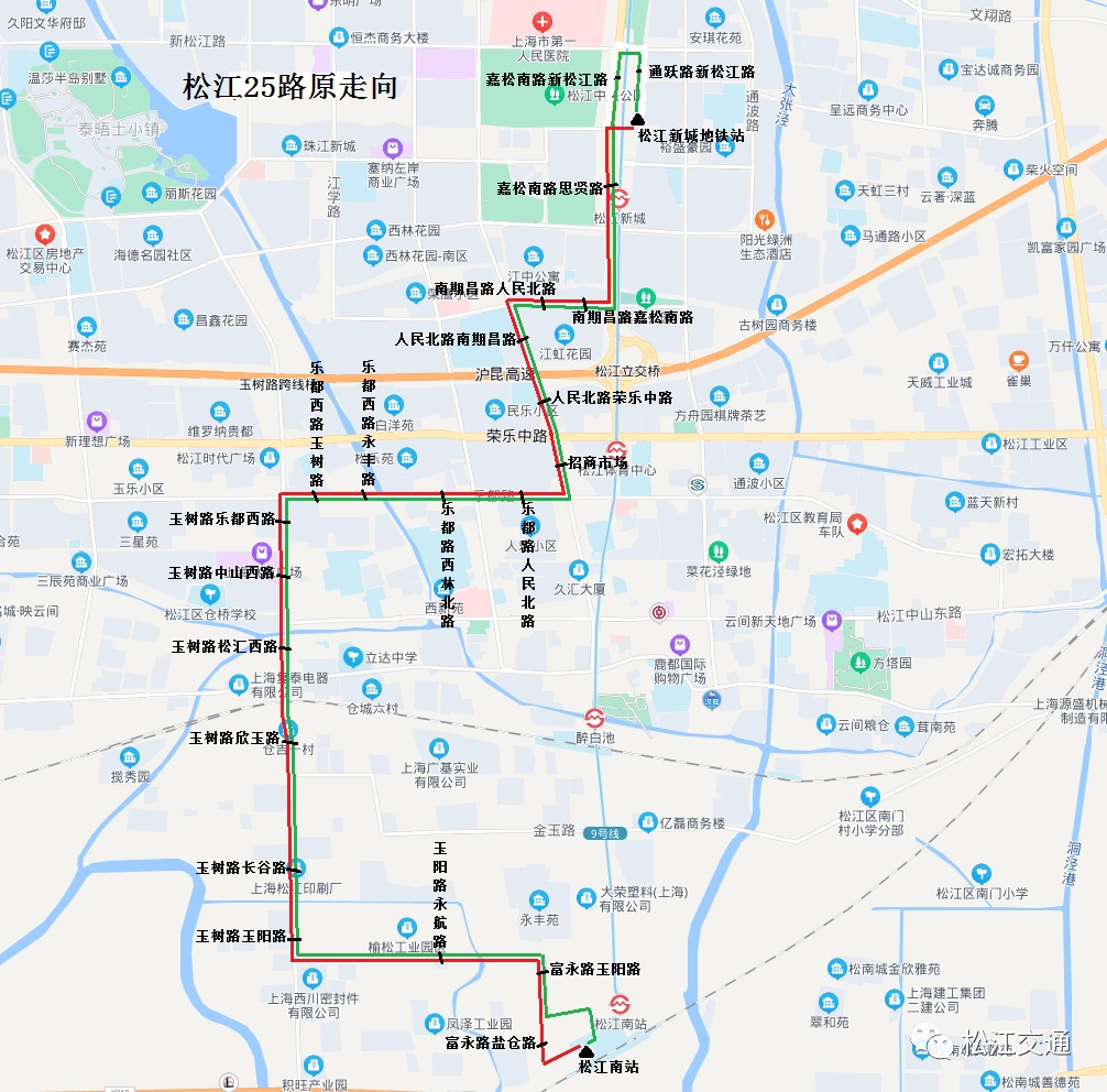 松江25路原走向:(上行)自松江新城地铁站起经通跃路、绿城路、嘉松公路、南期昌路、人民北路、乐都路、玉树路、玉阳路、富永路、盐仓路至松江南站。(下行)自松江南站起经盐仓路、中桥路、富永路、玉阳路、玉树路、乐都路、人民北路、南期昌路、嘉松公路、新松江路、通跃路至松江新城地铁站。