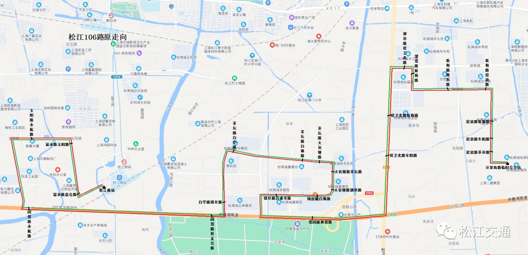 松江106路原走向:(上行)松江南站起经盐仓路、富永路、玉阳路、玉树路、闵塔公路、白苧路、茶坛路、大官塘路、银圩路、百雀寺路、闵塔公路、松卫北路、泖亭路、望塔路、联梅路、欣浪路至计家角路临时公交站。(下行)计家角路临时公交站起经欣浪路、联梅路、望塔路、泖亭路、松卫北路、闵塔公路、百雀寺路、银圩路、大官塘路、茶坛路、白苧路、闵塔公路、玉树路、玉阳路、富永路、盐仓路至松江南站。