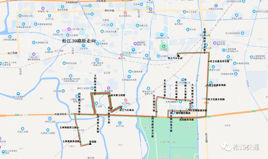松江39路原走向:(上行)自松江汽车东站起经松汇东路、松卫北路、闵塔公路、白粮路、银圩路、大官塘路、茶坛路、白苧路、闵塔公路、永航路、玉阳路、富永路、盐仓路、富永路、玉阳路、永航路、闵塔公路、玉树路、玉树南路至贵德路。(下行)自贵德路起经玉树南路、玉树路、闵塔公路、永航路、玉阳路、富永路、盐仓路、富永路、玉阳路、永航路、闵塔公路、白苧路、茶坛路、大官塘路、银圩路、白粮路、闵塔公路、松卫北路、松汇东路至松江汽车东站。