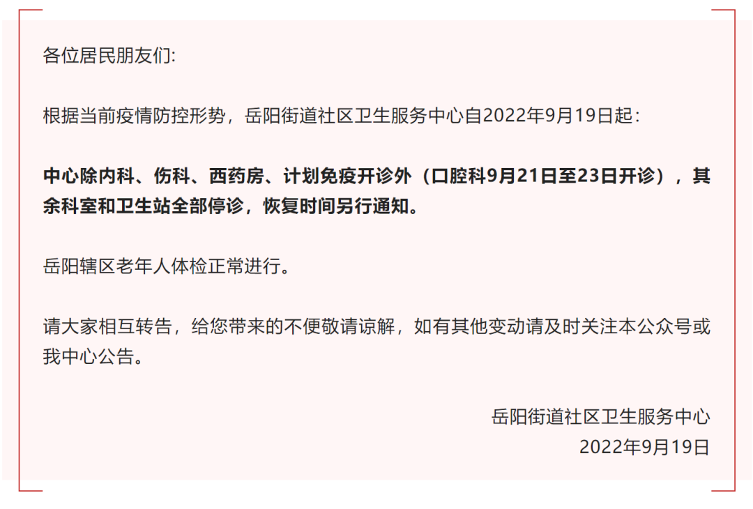 松江区岳阳街道社区卫生服务中心发布公告:根据当前疫情防控形势,岳阳街道社区卫生服务中心自2022年9月19日起:中心除内科、伤科、西药房、计划免疫开诊外(口腔科9月21日至23日开诊),其余科室和卫生站全部停诊,恢复时间另行通知。