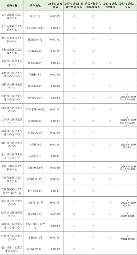 松江区各社区卫生服务中心与分中心提供社区新冠救治服务详细信息见附表。市民感染新冠后,如有吸氧、输液或住院服务需求,可拨打就近社区卫生服务中心或分中心24小时咨询电话咨询,社区卫生服务中心与分中心将在健康评估的基础上,为市民提供适宜的健康服务。