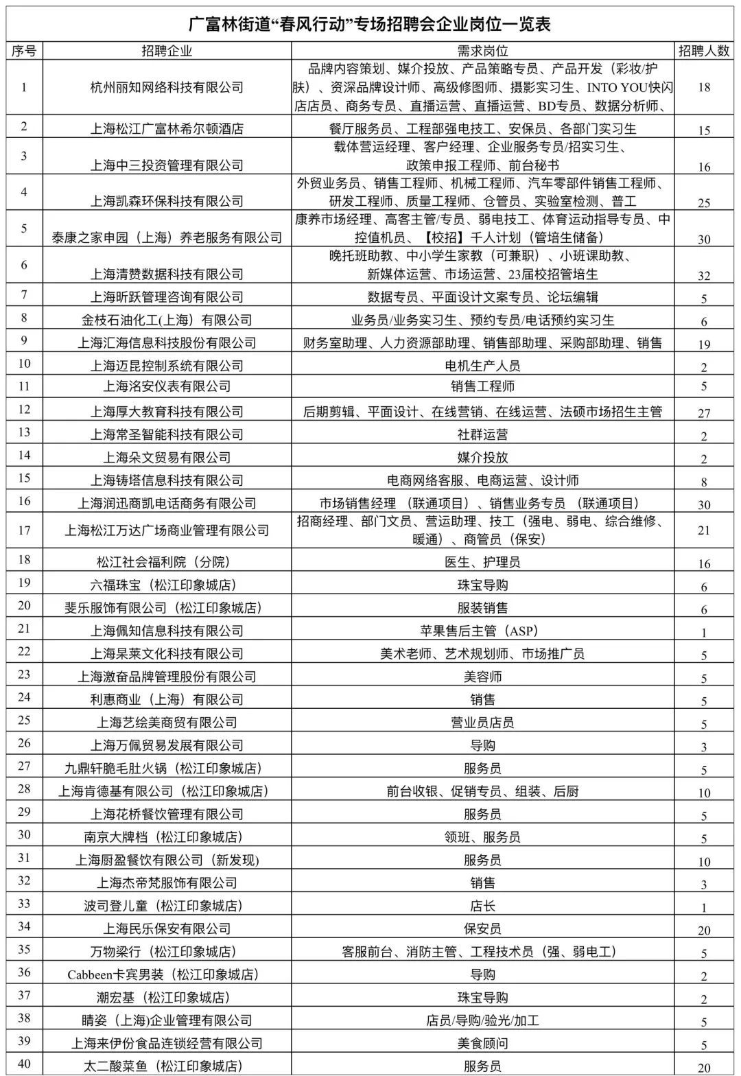 本次招聘会共40家企业,推出100个岗位,招聘413人,杭州丽知网络科技有限公司、上海松江广富林希尔顿酒店等知名企业、广富林辖区重点企业、松江印象城各大品牌商户齐聚现场,精选岗位不容错过。
