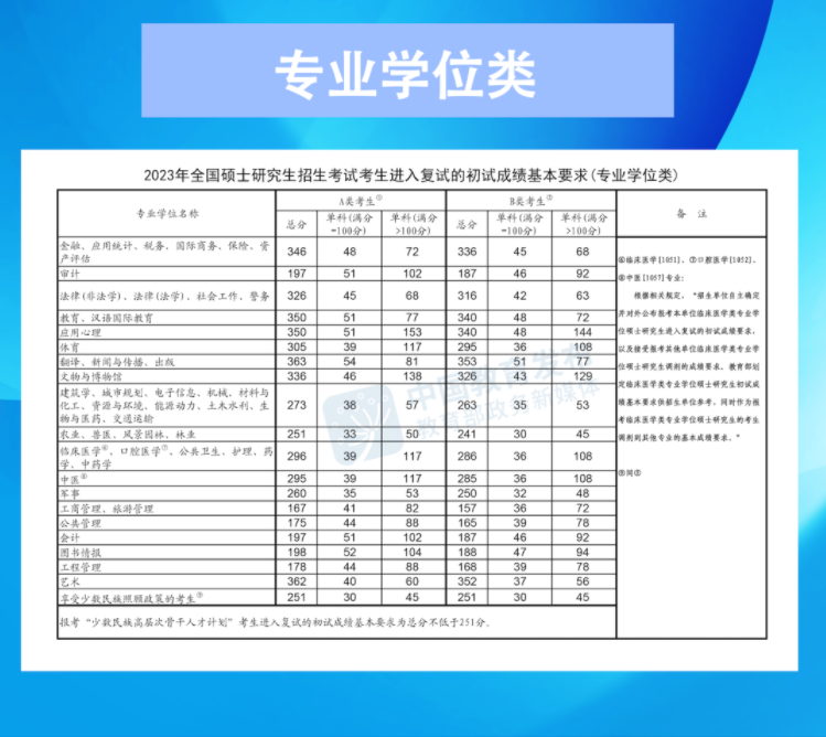 教育部同时发布《2023年全国硕士研究生招生考试考生进入复试的初试成绩基本要求》(国家分数线)。根据《2023年全国硕士研究生招生工作管理规定》,各招生单位将在国家分数线的基础上,自主确定并公布本单位考生进入复试的初试成绩要求及其他学术要求。