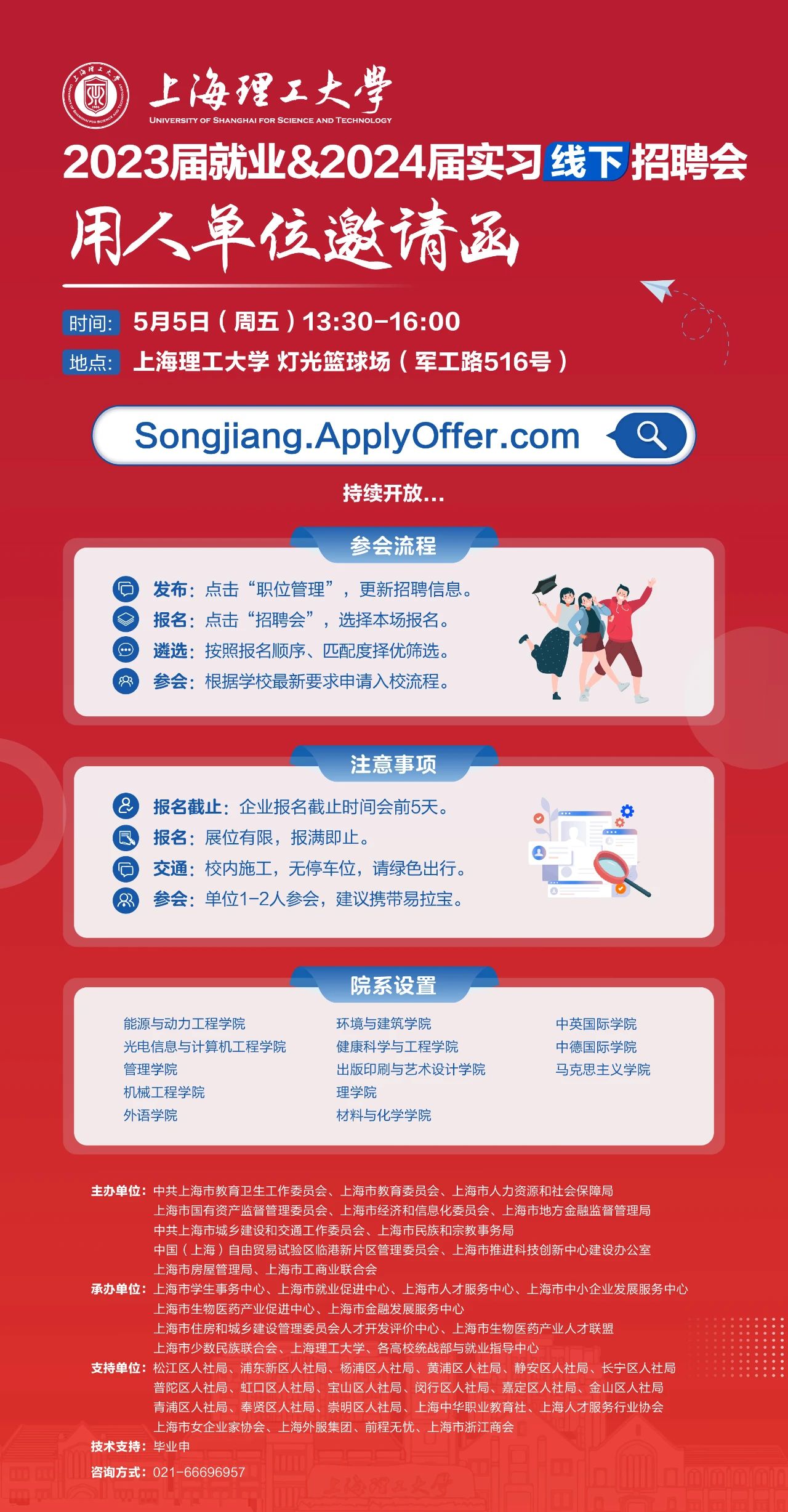 为落实教育部和上海市关于2023届毕业生就业工作的总体部署和相关要求,深化供需对接就业育人,促进毕业生更加充分、更高质量就业,同时为在校学生提供更多实习实践机会,现决定举办线下招聘会,诚邀各单位报名