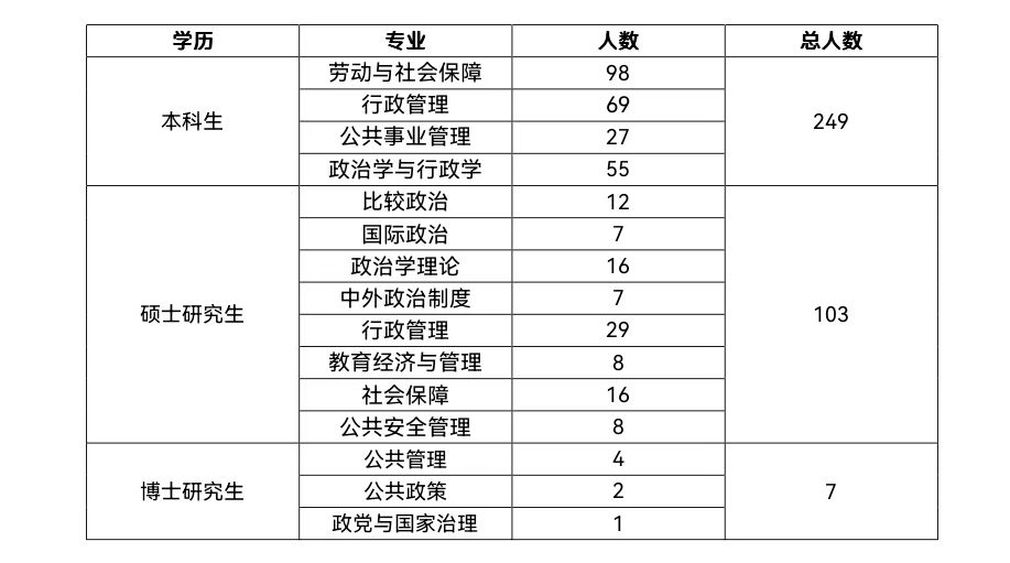 政府管理学院共有2023届本科毕业生249人,硕士毕业研究生103人,博士毕业研究生7人。传播学院共有2023届本科毕业生214人,硕士研究生85人。外语学院共有2023届本科毕业生173人,硕士研究生55人。诚邀贵单位报名参加本次招聘会,现将招聘会有关事项函告如下: