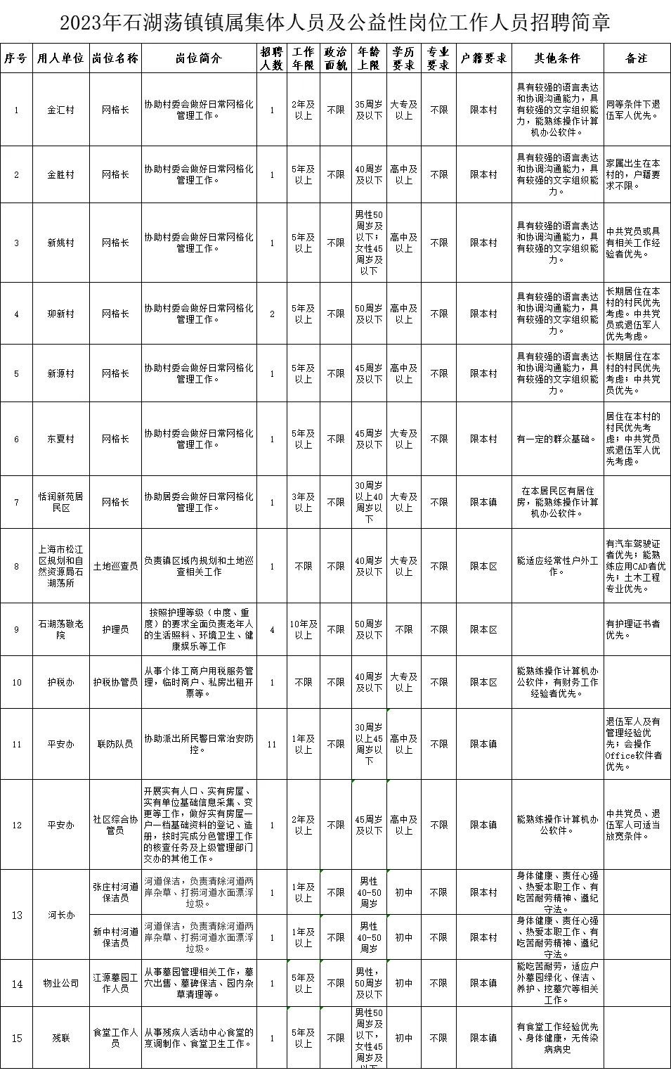 5.具体岗位及岗位所需的资格条件详见公告附件《2023年石湖荡镇镇属集体人员及公益性岗位工作人员招聘简章》。