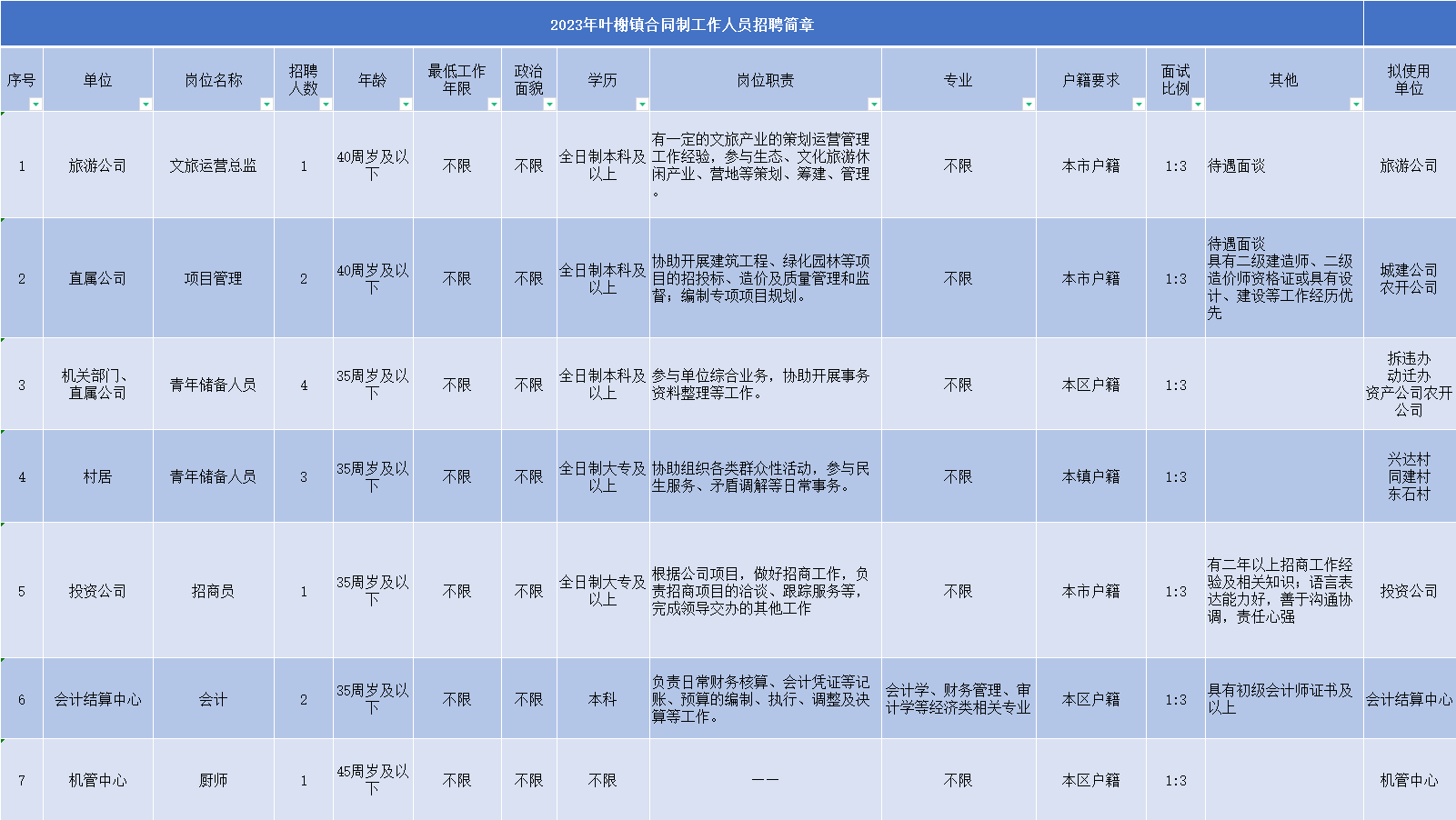 7、 符合报考具体岗位所列的其他要求。报考具体岗位所列的其他要求见《叶榭镇2023年度合同制工作人员公开招聘简章》(见附件下载)。