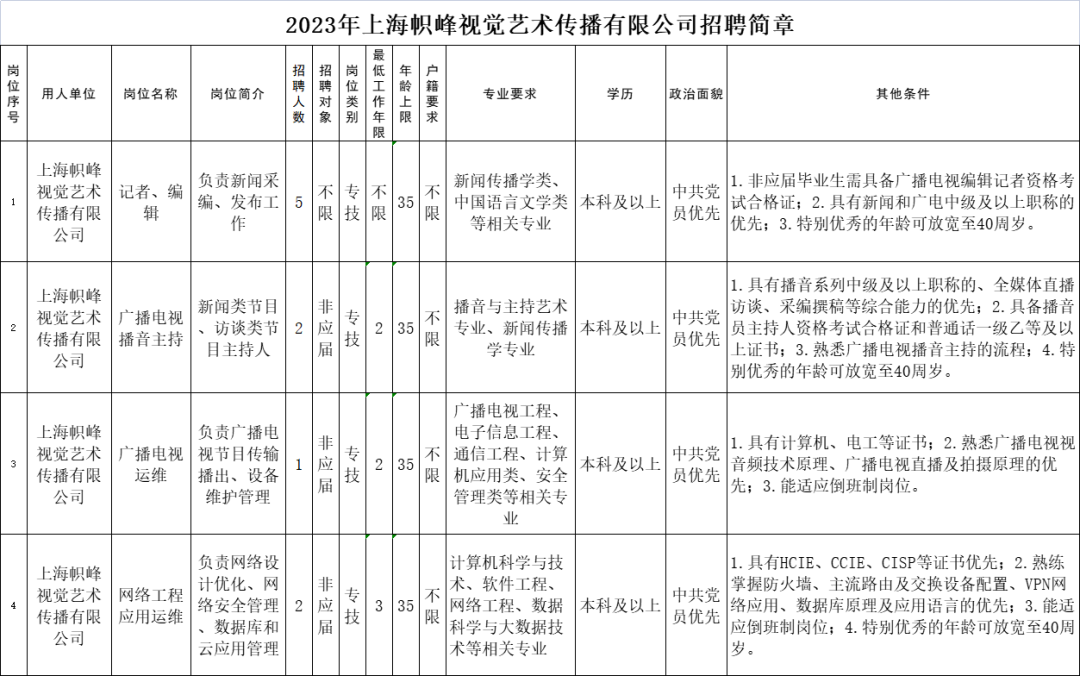 因松江融媒发展需要,由松江区融媒体中心托管的国有企业上海帜峰视觉艺术传播有限公司,现面向社会公开招聘工作人员10名。现将有关事项公告如下:
