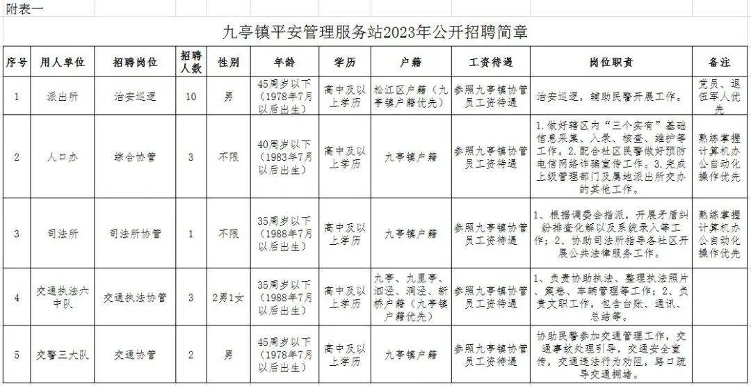 4.具体条件和岗位要求详见《九亭镇平安管理服务站2023年公开招聘简章》。