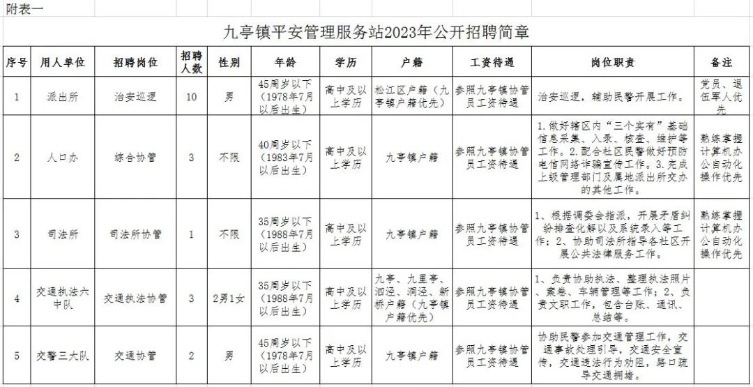 4.具体条件和岗位要求详见《九亭镇平安管理服务站2023年公开招聘简章》(附表一)。