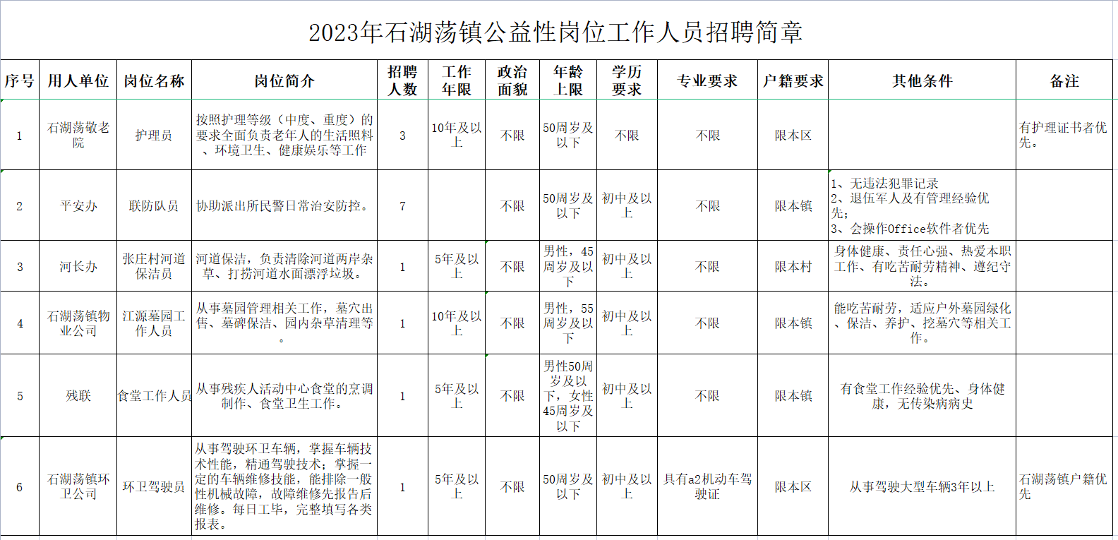 5.具体岗位及岗位所需的资格条件详见公告附件2《2023年石湖荡镇公益性岗位工作人员招聘简章》。