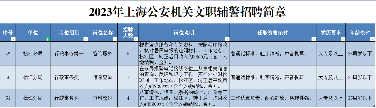 本次公开招聘公安辅警的具体招聘单位、职位、资格条件等详见《2023年上海公安机关勤务辅警招聘简章》、《2023年上海公安机关文职辅警招聘简章》,8月21日起可通过“上海公安机关辅警招聘考试专题网站”(https://www.shacs.gov.cn/Link/202309.htm)进行查询。