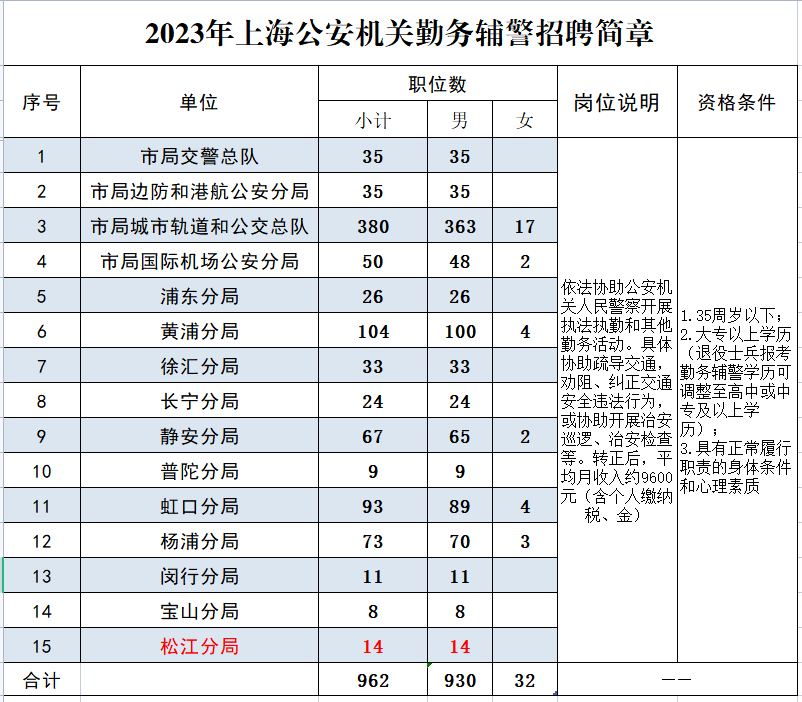 上海市公安局将于即日起面向社会公开招聘公安辅警1248名。其中,勤务辅警962名、文职辅警286名。具有上海市常住户口的社会人员及上海生源2023届普通高等院校毕业生均可报名。