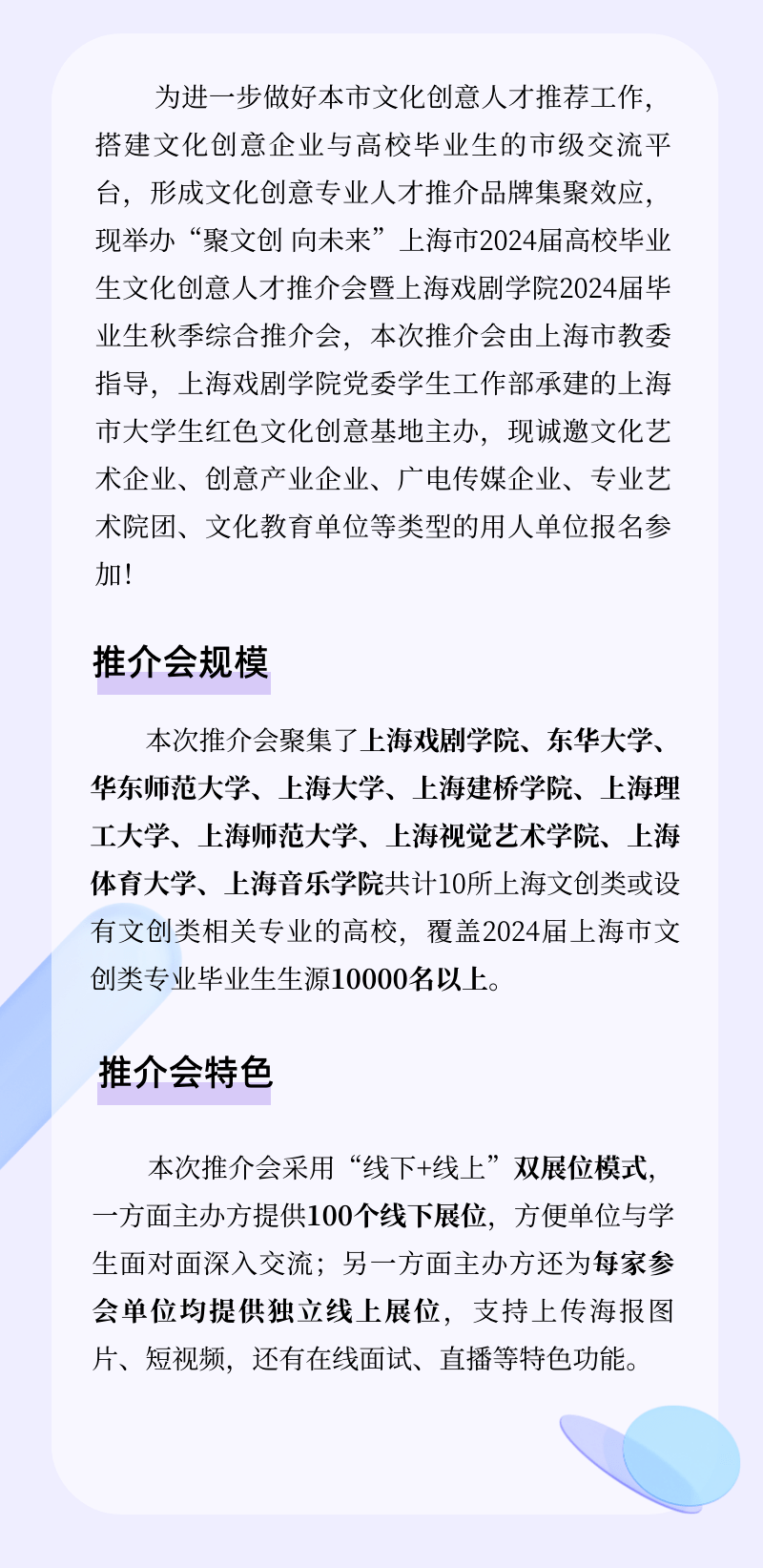 1、本次推介会由上海市10所文创类或有文创类相关专业的高校联合举办,覆盖全市文创类2024届10000名以上预毕业生生源;