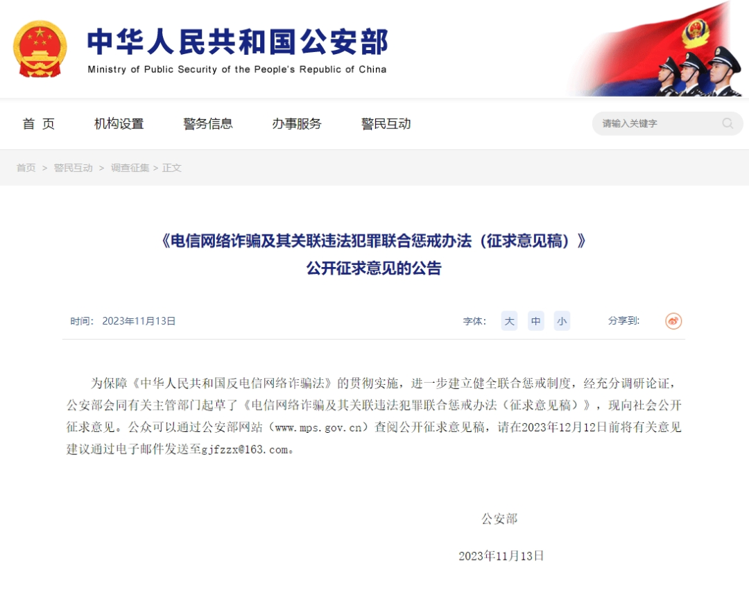 公安部会同有关主管部门起草了《电信网络诈骗及其关联违法犯罪联合惩戒办法(征求意见稿)》,面向社会广泛征求意见。登录https://www.mps.gov.cn/n2254536/n4904355/c9288546/content.html,可查看《电信网络诈骗及其关联违法犯罪联合惩戒办法(征求意见稿)》。公众可在12月12日前将有关意见建议通过电子邮件发送至gjfzzx@163.com。