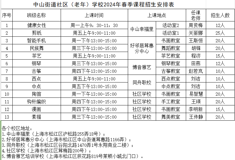 为进一步满足社区居民多样化的学习需求,提升社区教育和老年教育的品质,中山街道社区(老年)学校决定开展2024年春季招生工作。现将有关事项告知如下: