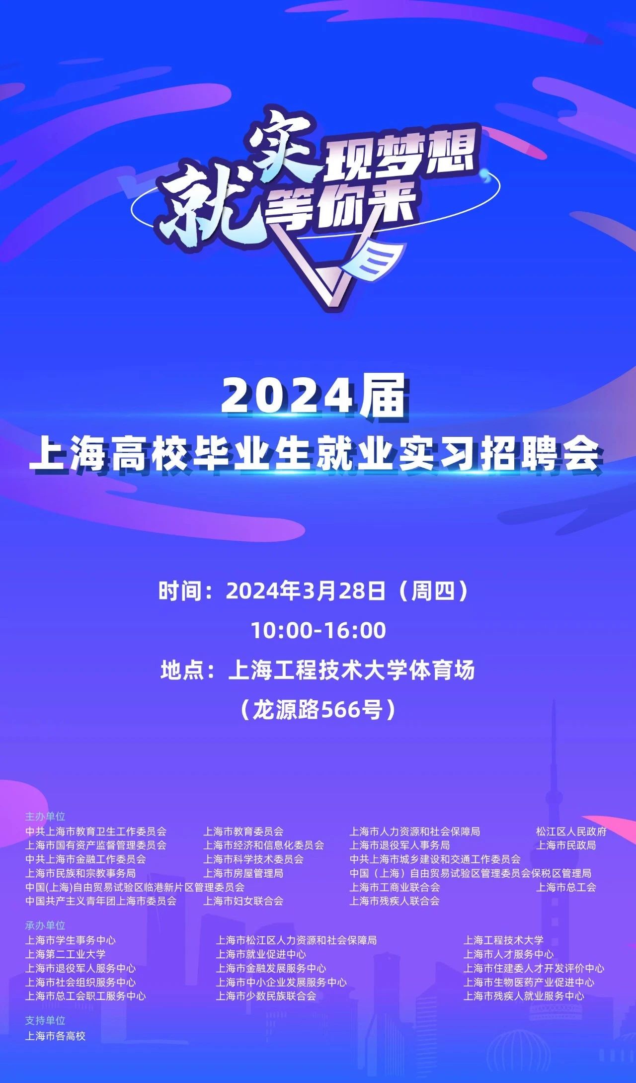 主办单位:中共上海市教育卫生工作委员会、上海市教育委员会、上海市人力资源和社会保障局、松江区人民政府、上海市国有资产监督管理委员会、上海市经济和信息化委员会、上海市退役军人事务局、上海市民政局、中共上海市金融工作委员会、上海市科学技术委员会、中共上海市城乡建设和交通工作委员会、上海市民族和宗教事务局、上海市房屋管理局、中国(上海)自由贸易试验区管理委员会保税区管理局、中国(上海)自由贸易试验区临港新片区管理委员会、上海市工商业联合会、上海市总工会、中国共产主义青年团上海市委员会、上海市妇女联合会、上海市残疾人联合会